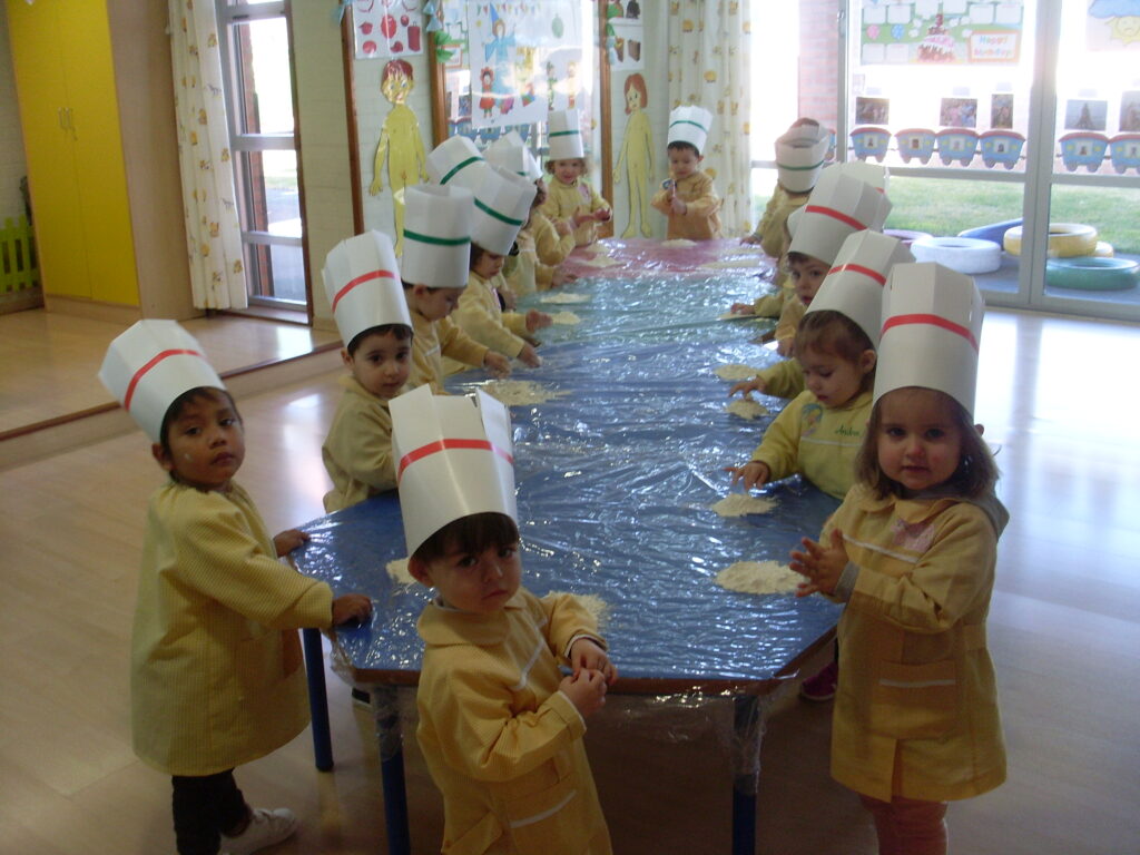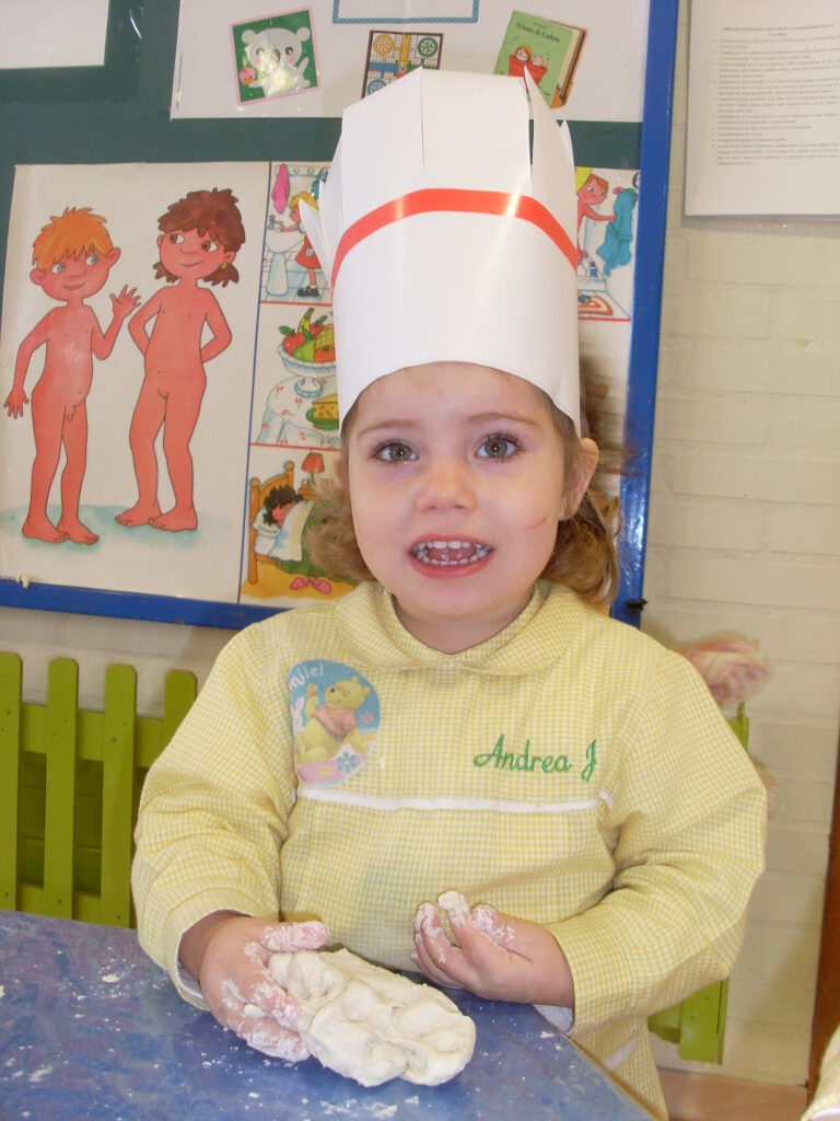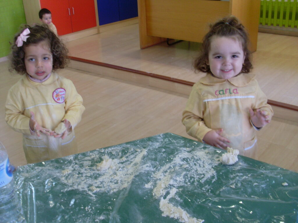 Una vez se han marchado las familias de las clases, hemos preparado el espacio donde íbamos a amasar para hacer el pan que es parte fundamental de la «culeca». Forradas las mesas, hemos dado rienda suelta al amasado….. harina y agua y a AMASARRRRR.
