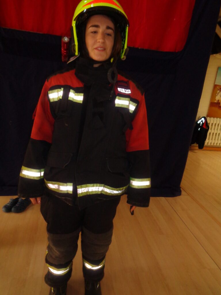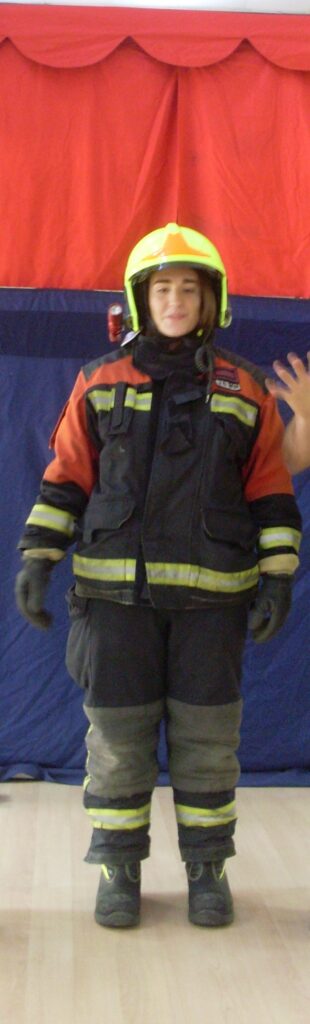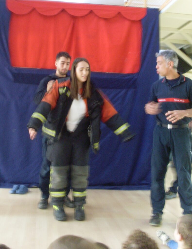 Primero nos han saludo y explicado lo importante que es protegerse del fuego, y como, para evitar quemarse, cuando tienen que apagar un incendio, llevan un equipo con botas, pantalones y chaqueta, casco y guantes.