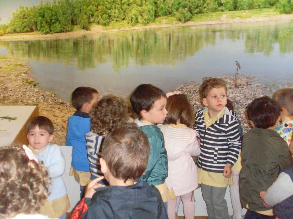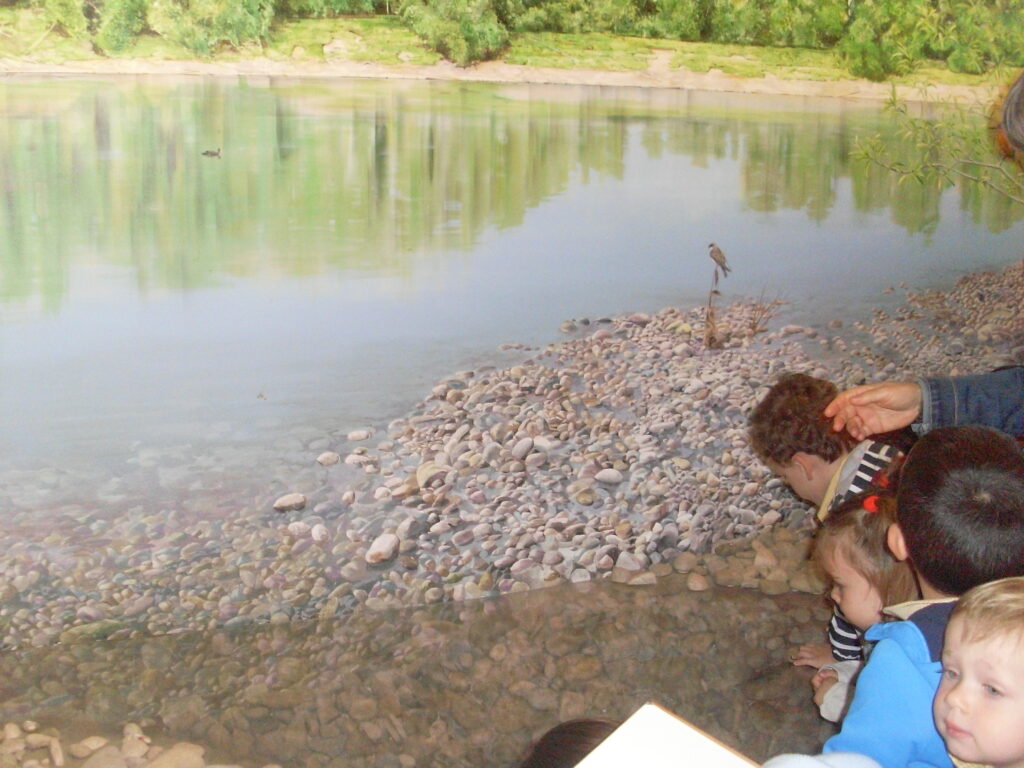 Ya con muchas ganas de ver cigüeñas, pasamos a la gran sala luminosa y acogedora donde se reproducen los sotos con su diversidad de fauna y flora, mediante una pintura realista ambientada con el trino de los pájaros y otros sonidos de animales propios del soto.